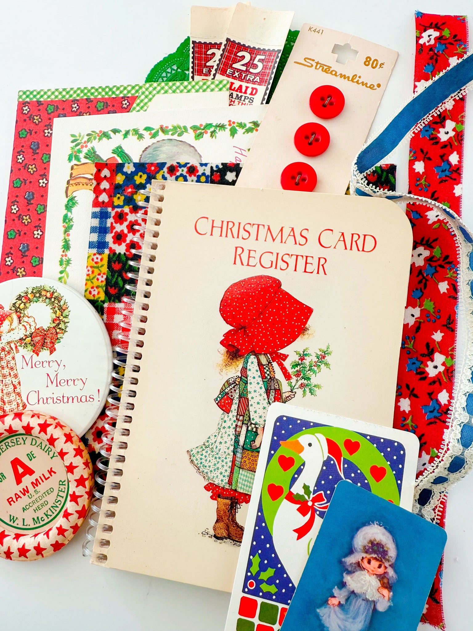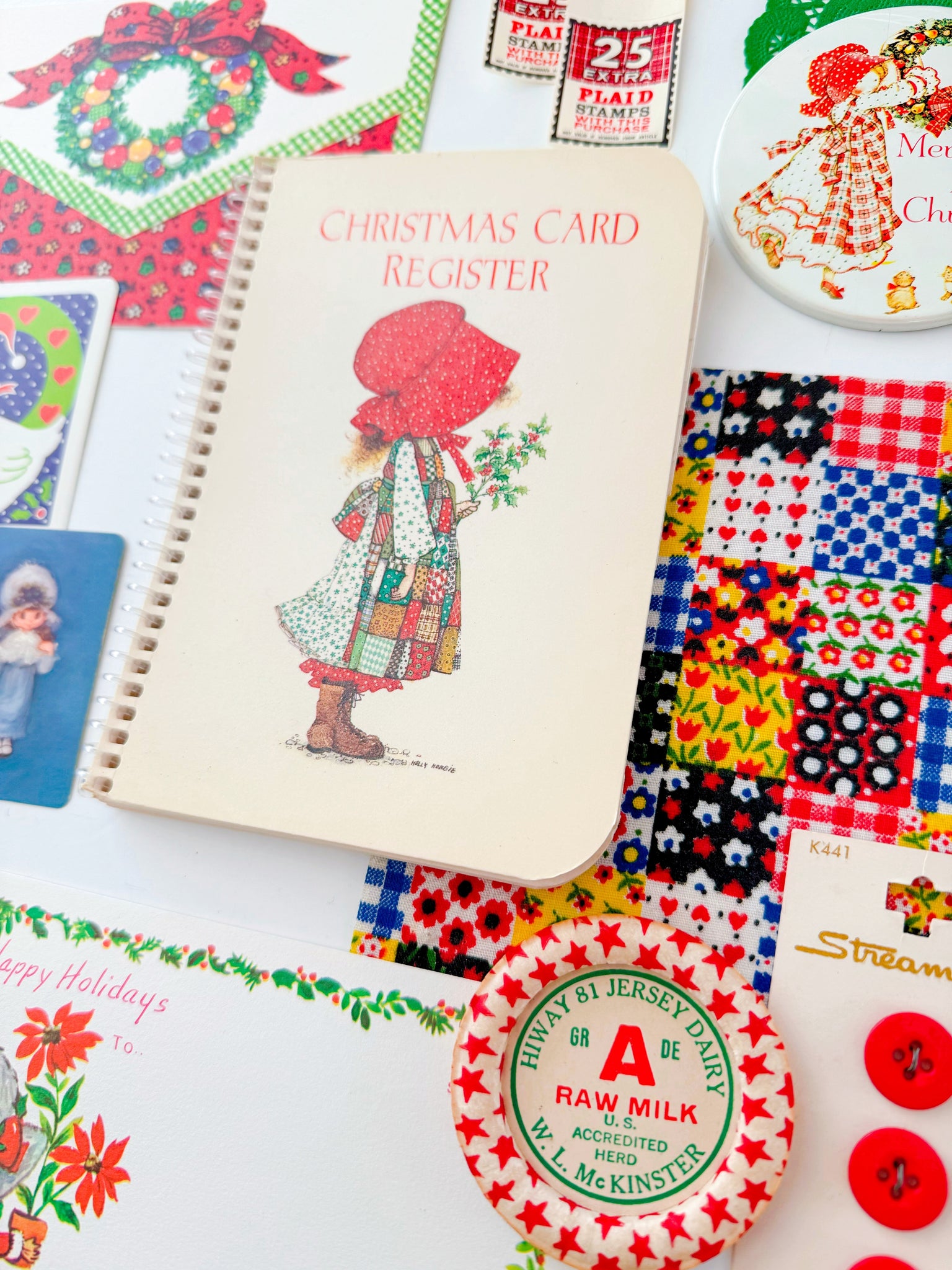 A curated collection of vintage ephemera including unused Holly Hobbie Christmas card register, Holly Hobbie Christmas button pin, & coordinating ephemera. See pictures for details, only one available!