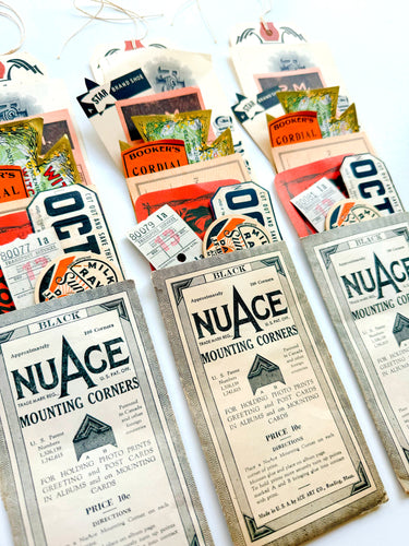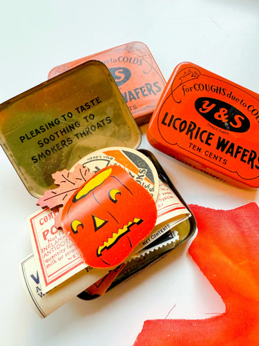 Vintage orange & black licorice tin filled with Halloween ephemera