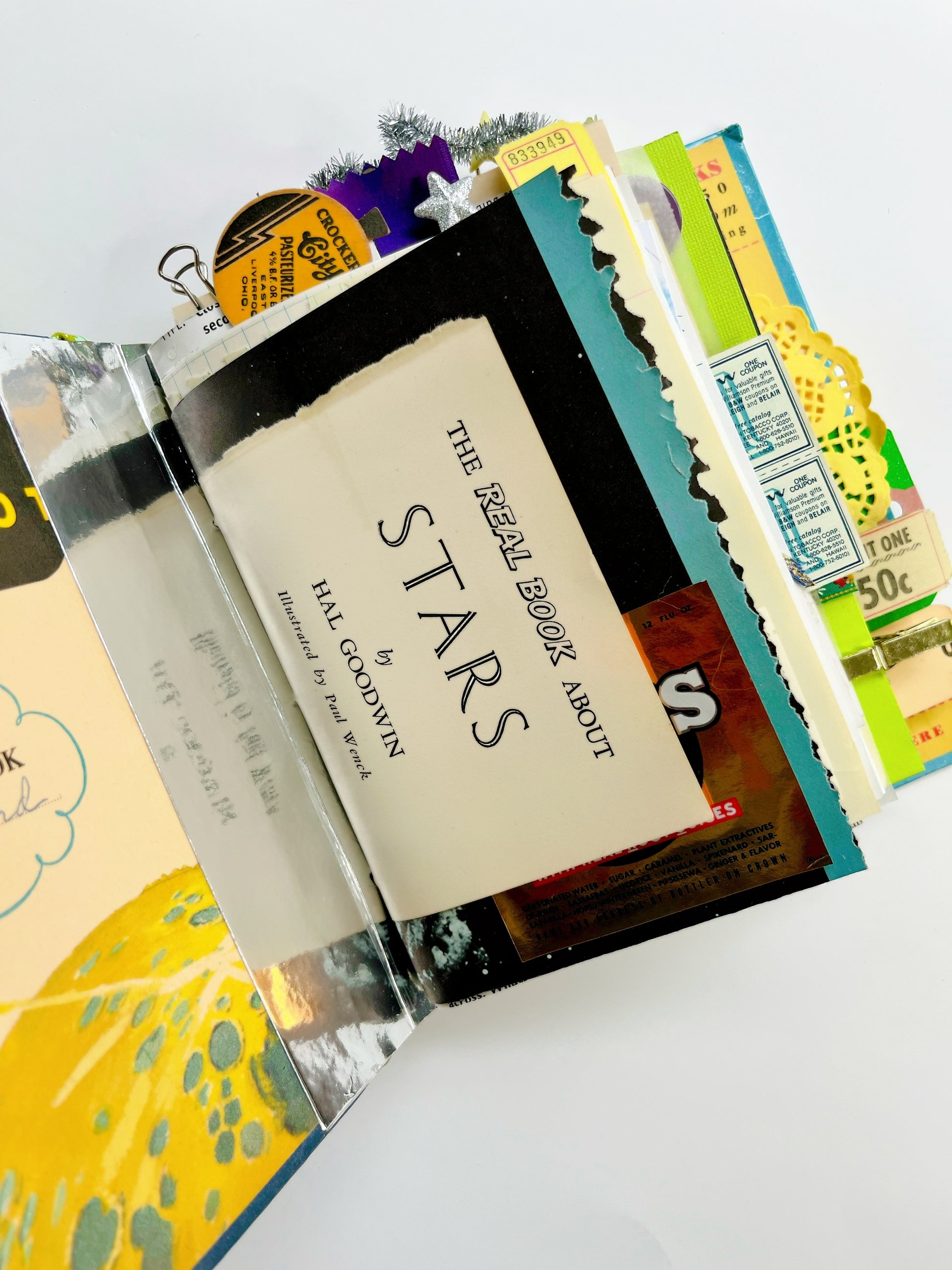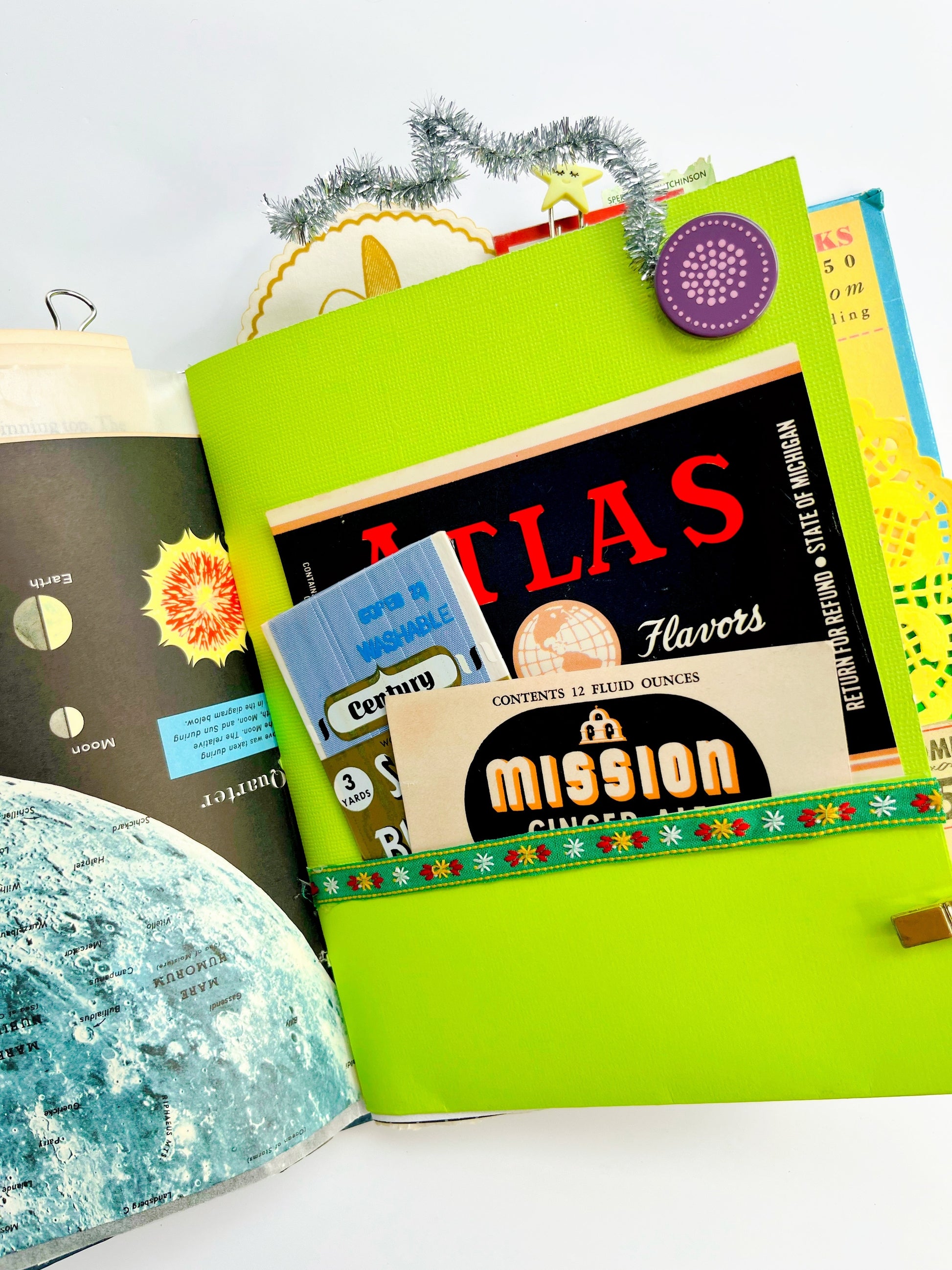 Three handsewn signatures. An eclectic assortment of vintage papers and ephemera with a space theme.