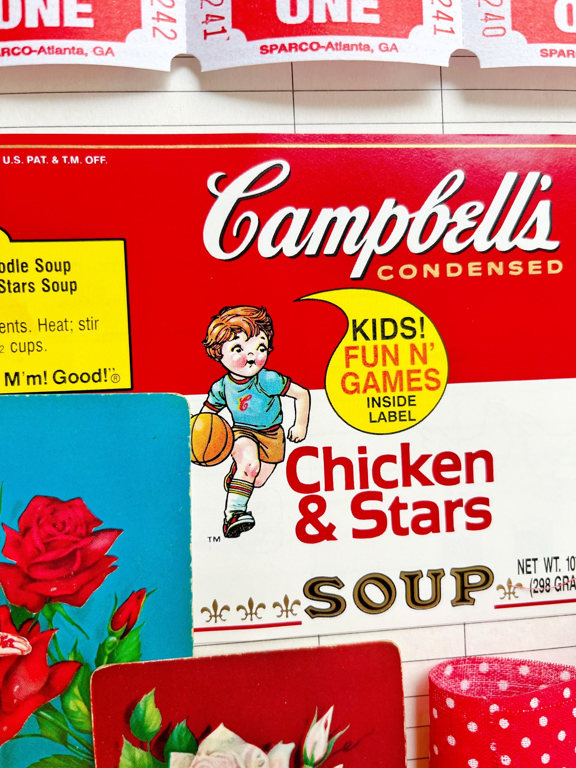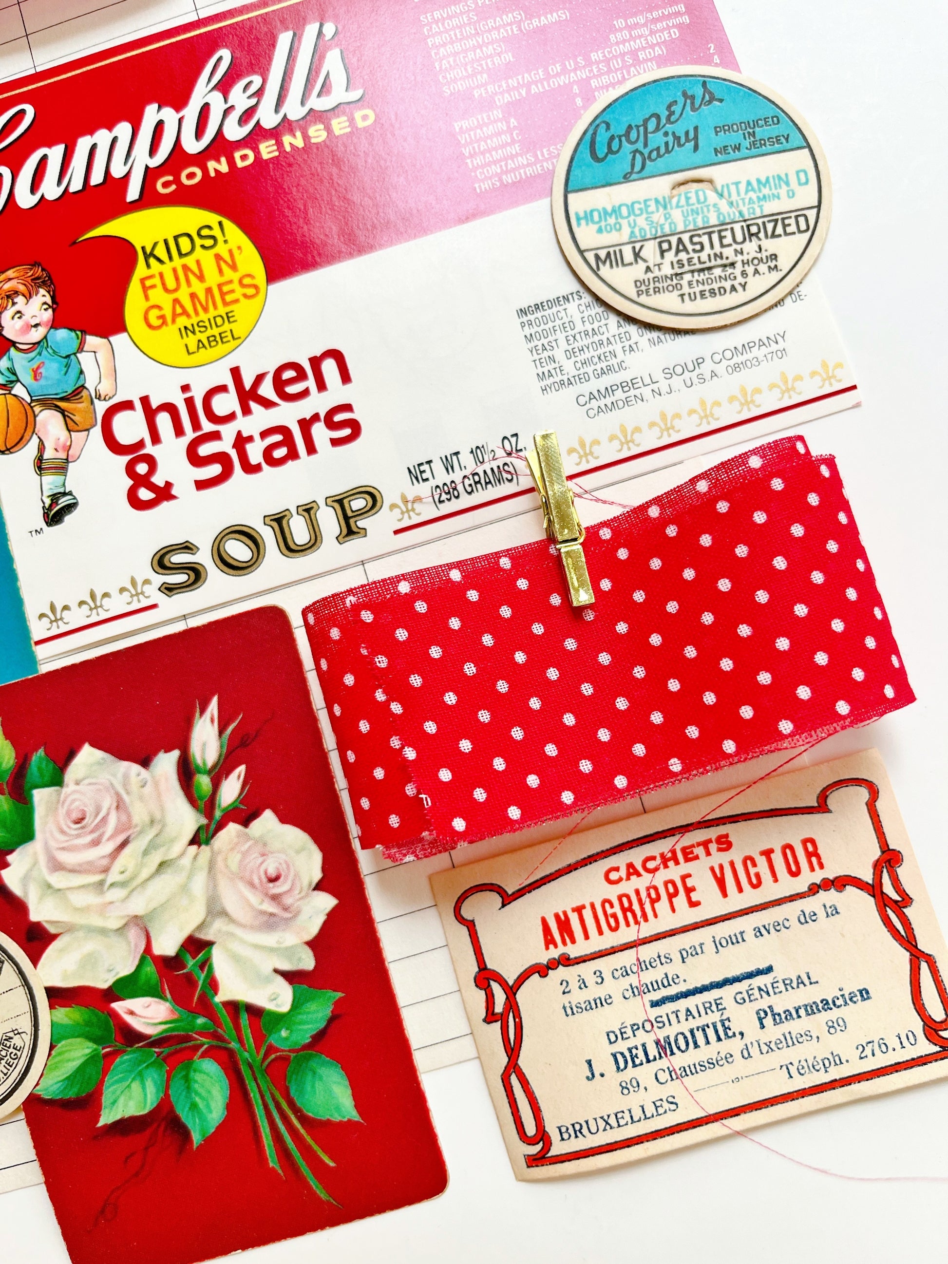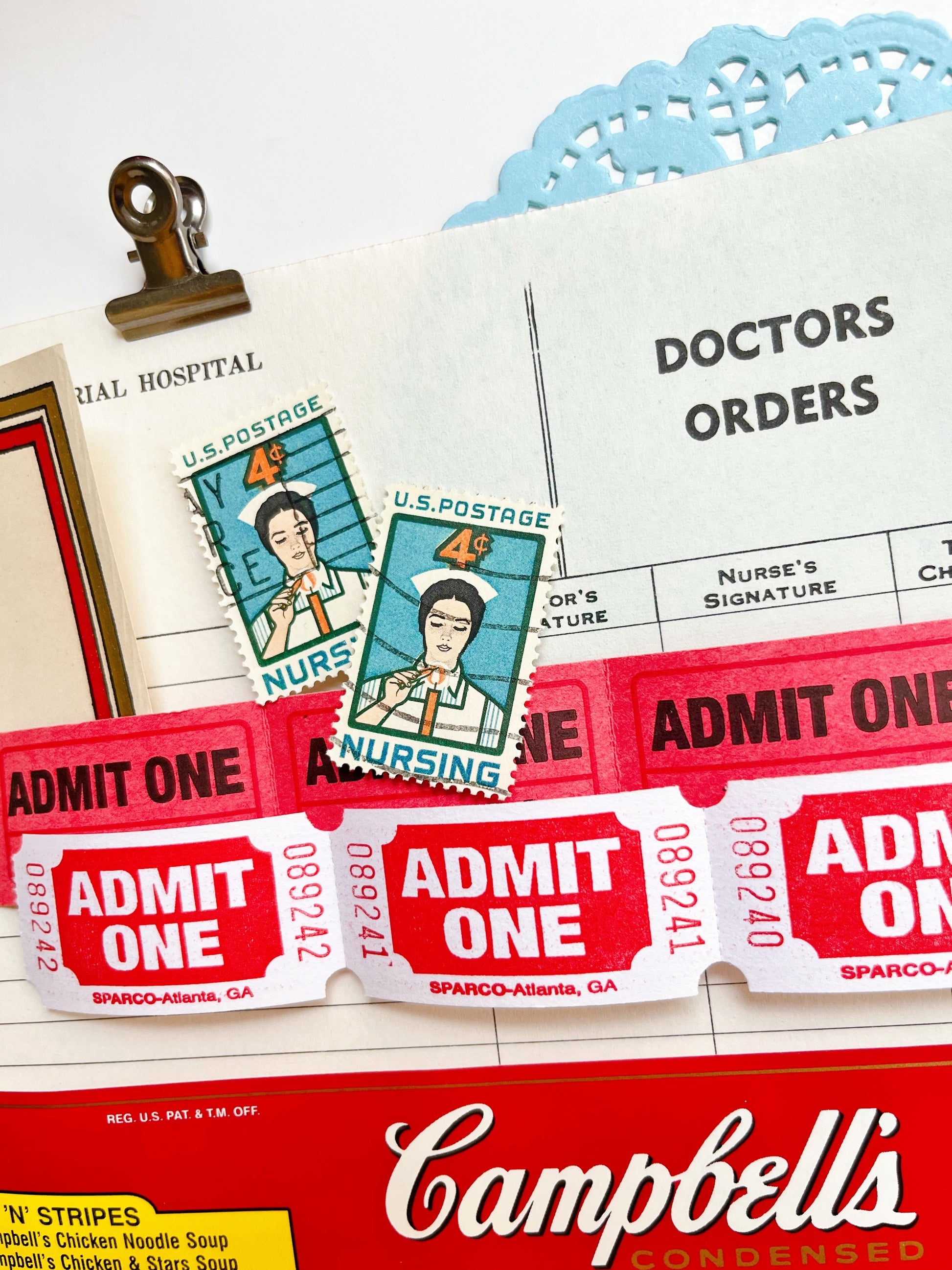 A curated collection of authentic vintage ephemera and reproduction images. Vintage “Doctor’s Orders” notepad sheet, Campbell’s chicken & stars soup label, Rx labels,playing cards, stamps, tickets, milk cap, and more.