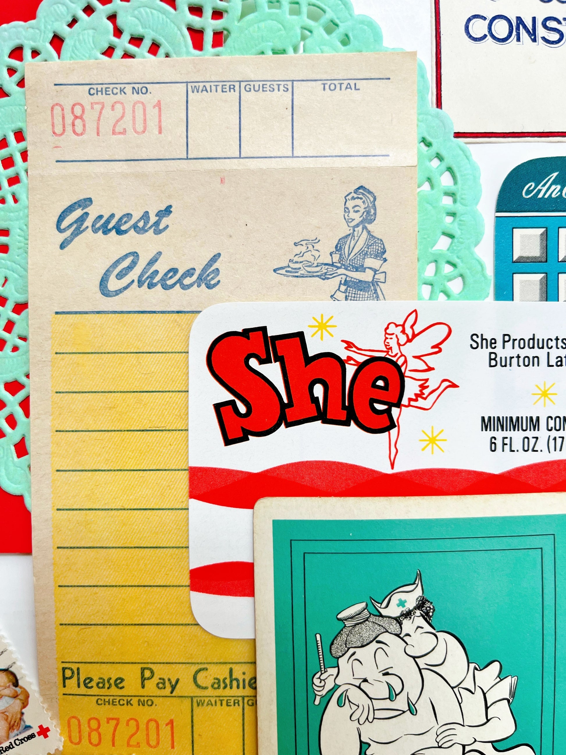 This curated collection includes authentic vintage ephemera and reproduction images. You get all pieces shown. Vintage liquor label, soda label, Rx label, tickets, stamps, playing card with joke on the back, and more.