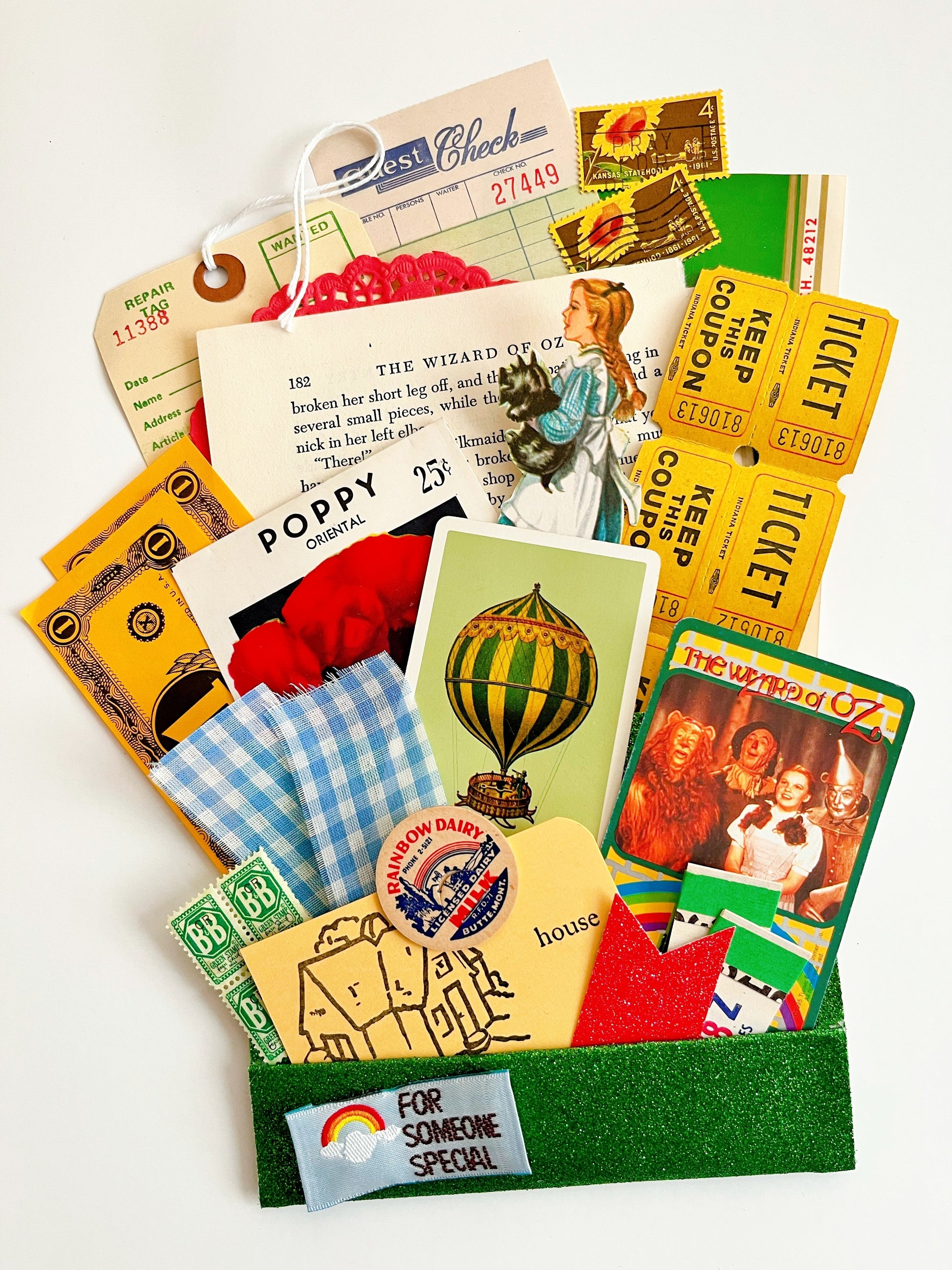 A curated assorted of authentic vintage ephemera and newer pieces with a Wizard of Oz theme all tucked into an emerald cardstock double pocket.
