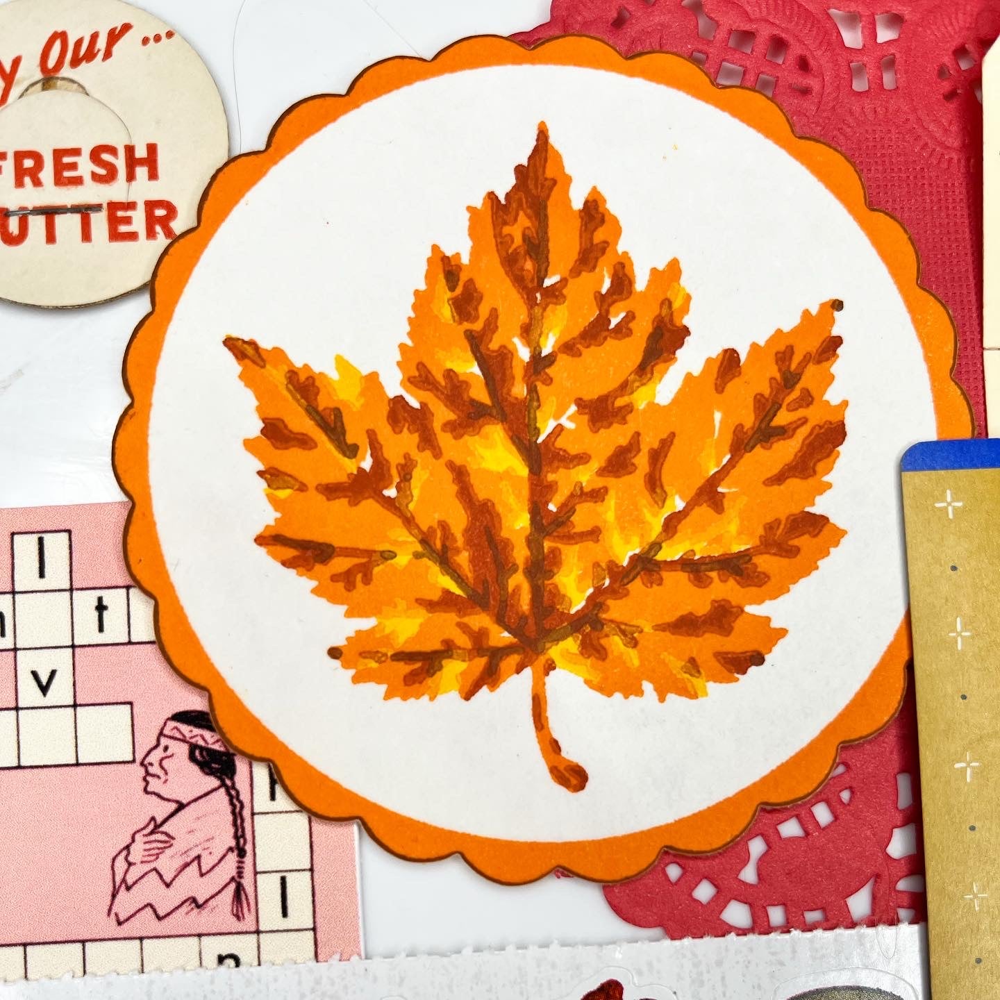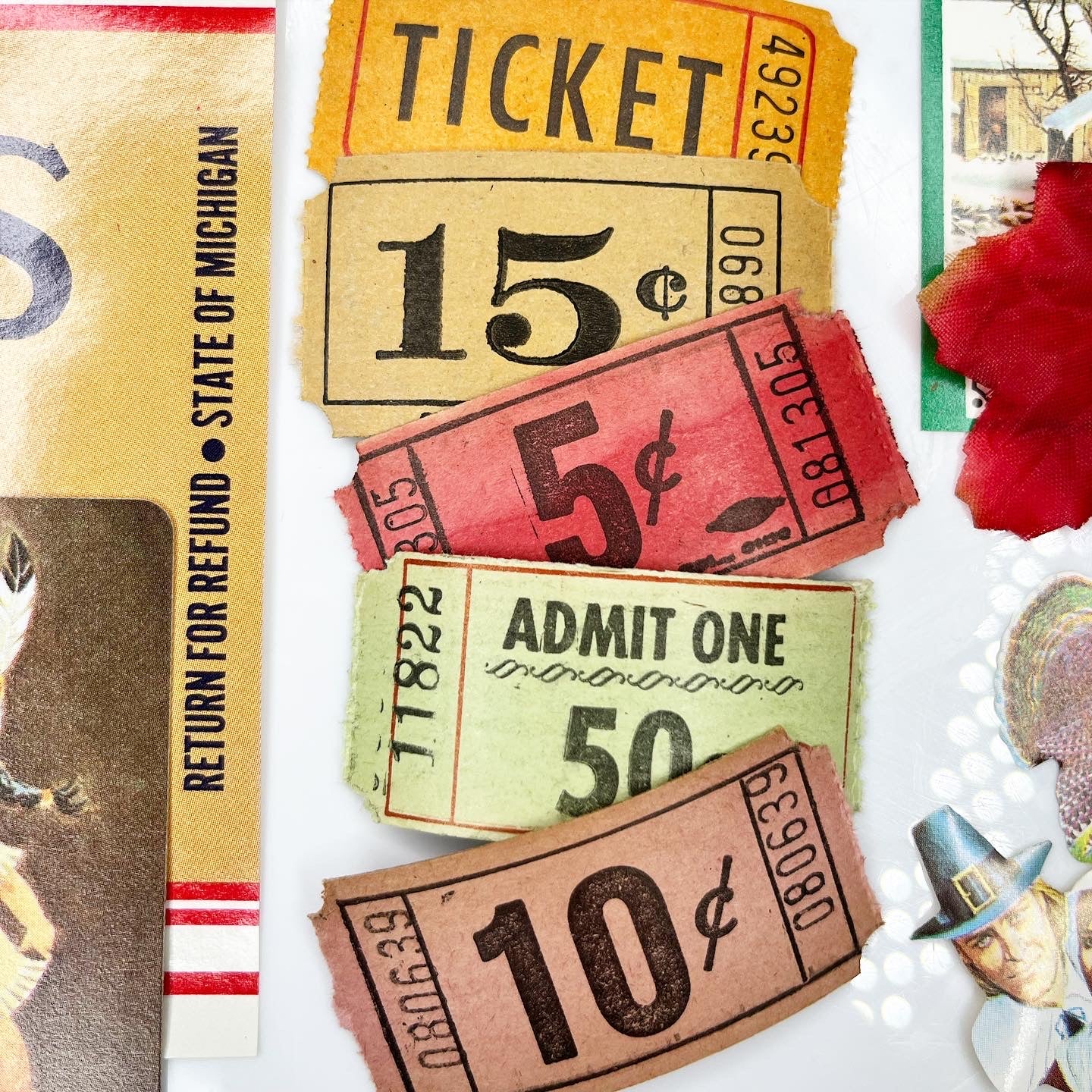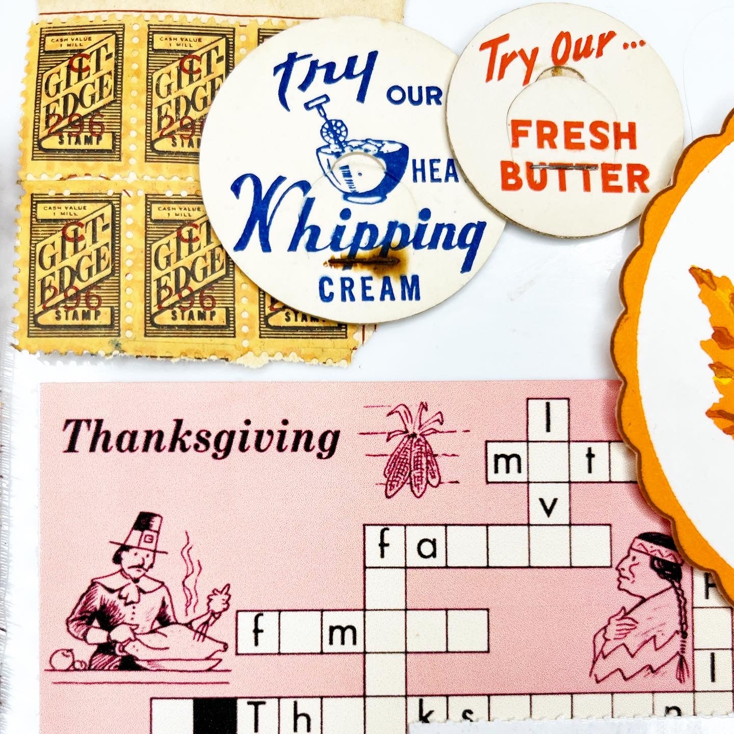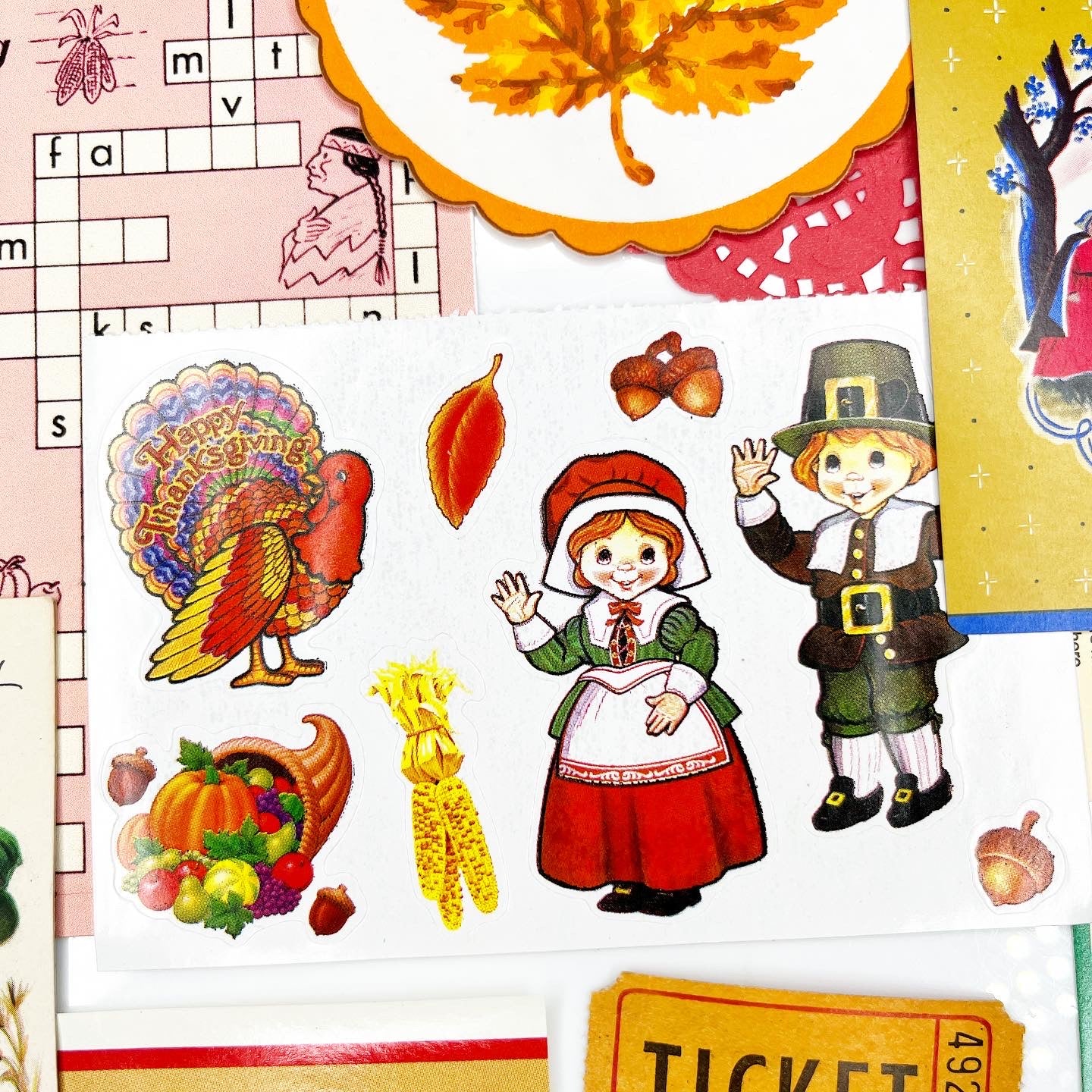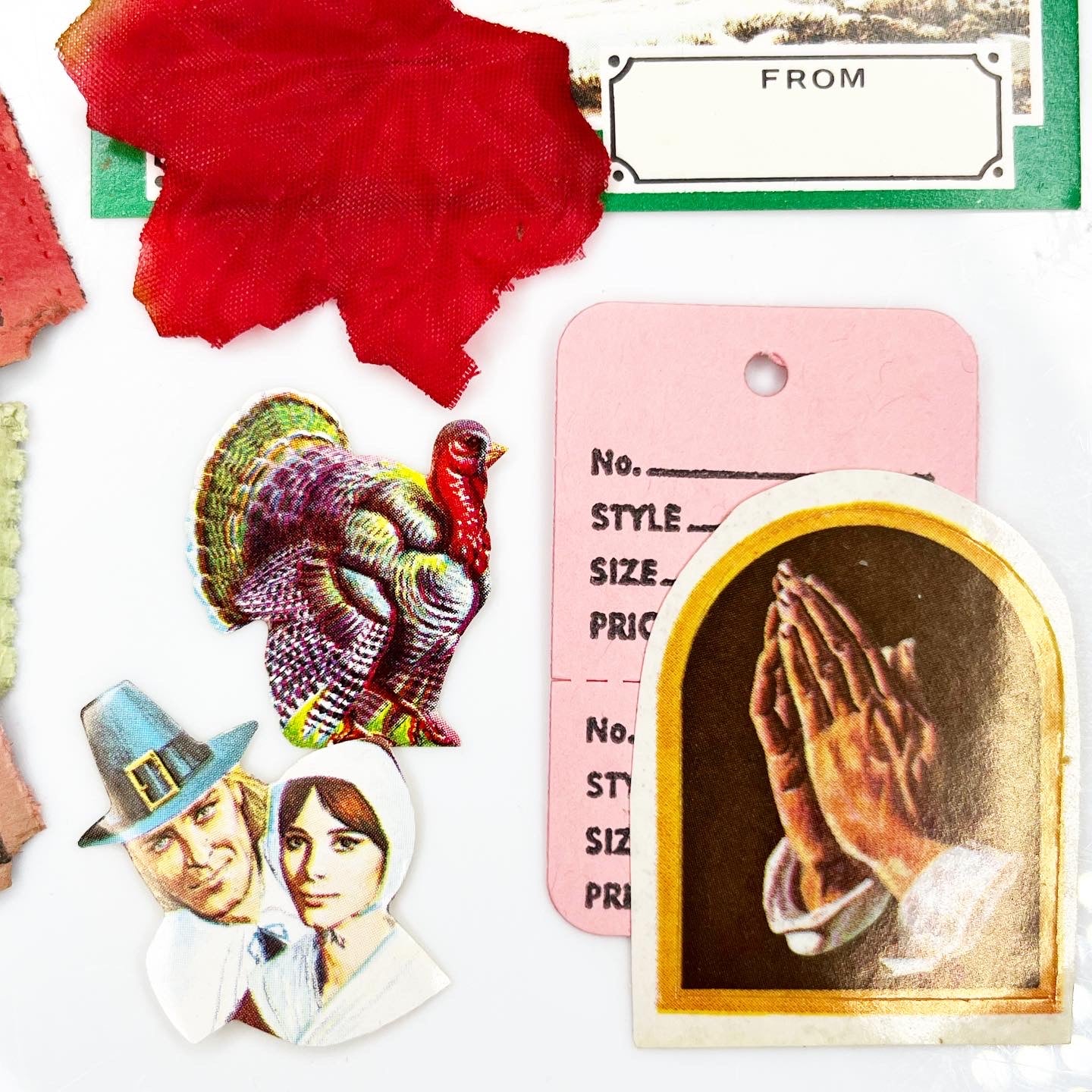 This “Pilgrims & Indians” ephemera collection contains authentic vintage elements including vintage tally card, playing cards, tags, tickets, milk caps, paper coaster, seals, label, stickers and more.
