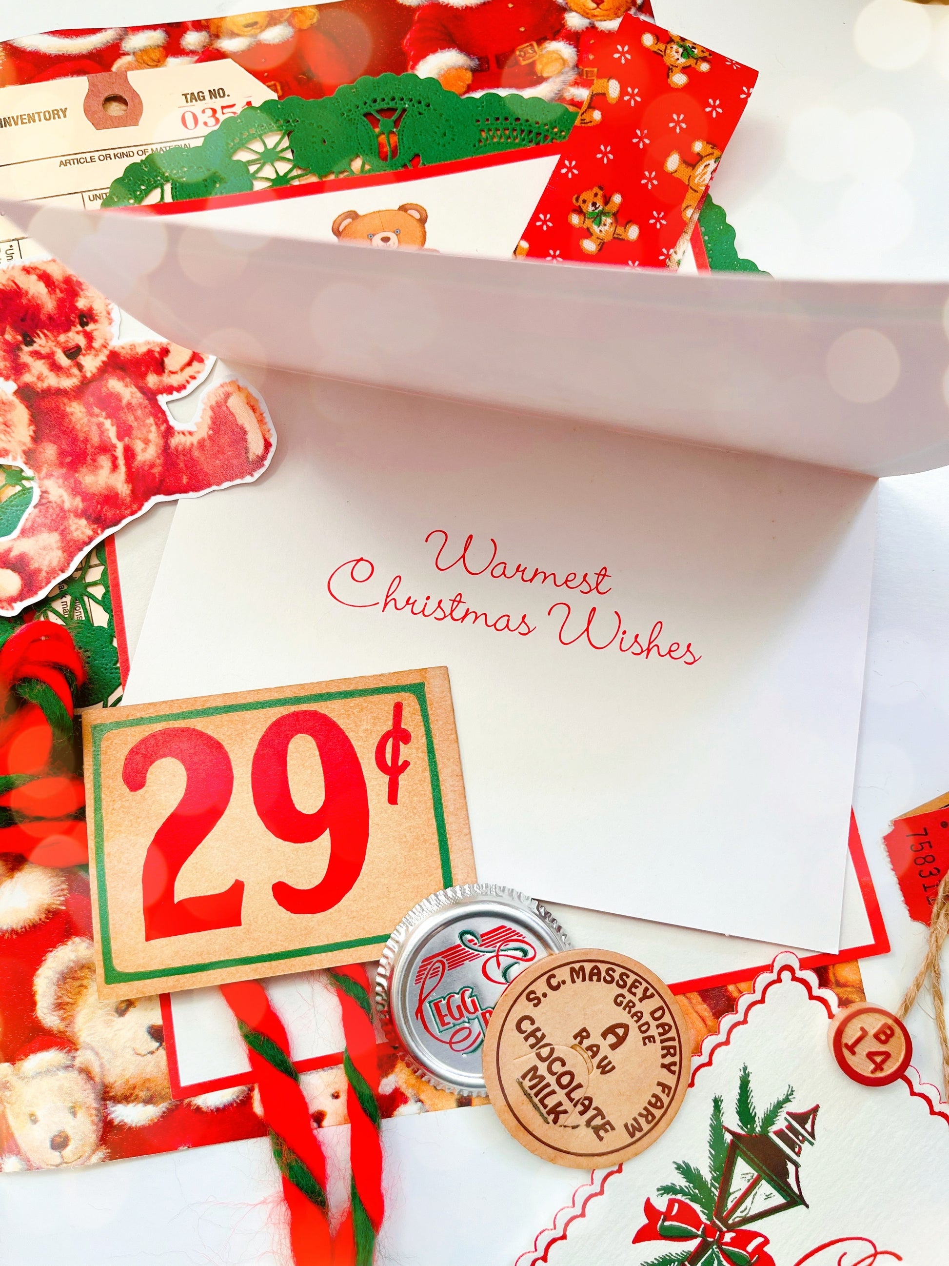 A curated collection of vintage ephemera with a nostalgic teddy bear motif.